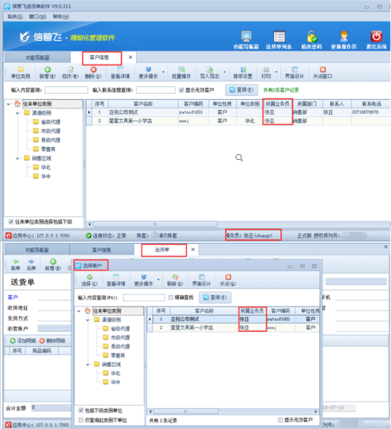 以“信管飛送貨單軟件”為例,示范下如何控制操作員僅能查看所屬為自己的客戶信息。首先需要在客戶信息中進行整理下客戶的所屬業務員信息,如下圖1所示,示例以員工“張亞”為例。
