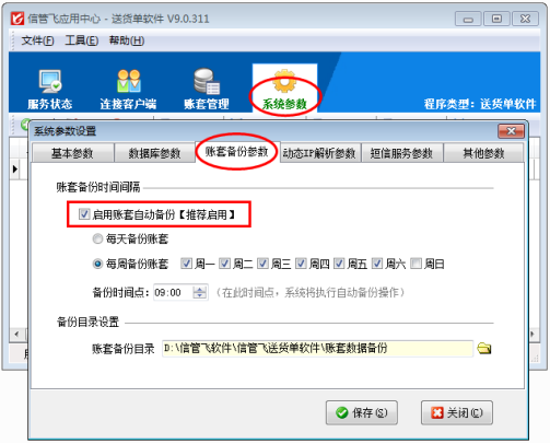 信管飛送貨單軟件、信管飛RMS、信管飛出納記賬軟件、信管飛倉庫管理軟件及信管飛票據(jù)軟件都支持設(shè)置賬套自動(dòng)備份,我們強(qiáng)烈建議啟用自動(dòng)備份功能,以便賬套出現(xiàn)問題的時(shí)候從賬套備份文件中恢復(fù)數(shù)據(jù)。下面我們以信管飛送貨單軟件為例詳細(xì)介紹一下如何啟用賬套自動(dòng)備份功能?