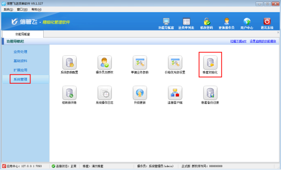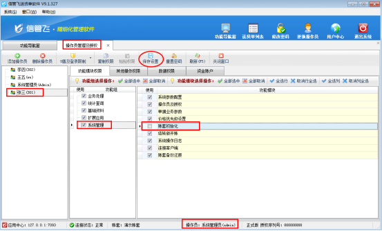 信管飛送貨單軟件、信管飛RMS、信管飛倉庫管理軟件、信管飛出納記賬軟件中都可以進行賬套初始化,在正式使用軟件過程中,為了防止操作員不小心初始化賬套,可以對操作員設置操作權限。下面我們以信管飛送貨單軟件為例來演示一下如何設置操作員不可賬套初始化。