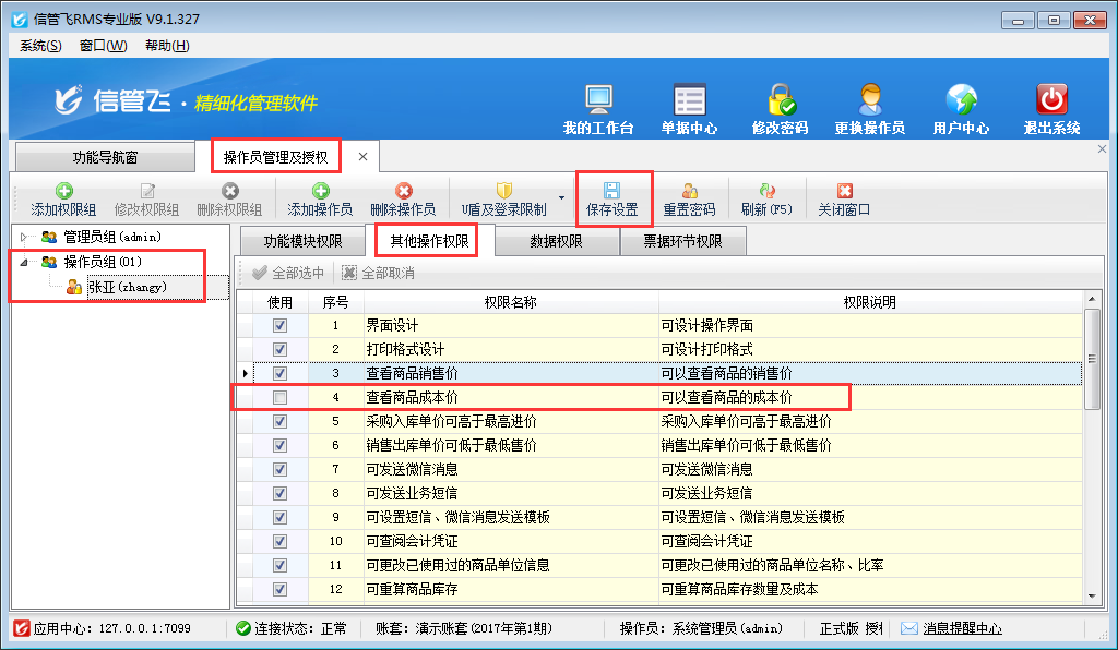 信管飛RMS、信管飛倉庫管理軟件及信管飛送貨單軟件內(nèi)都可以設(shè)置多個操作員并對操作員賬號設(shè)置權(quán)限,部分用戶不希望員工賬號可以查看到商品成本價格,如何設(shè)置呢?本篇文章以信管飛RMS專業(yè)版為例詳細介紹一下進銷存管理軟件內(nèi)如何設(shè)置操作員不可查看商品成本價?