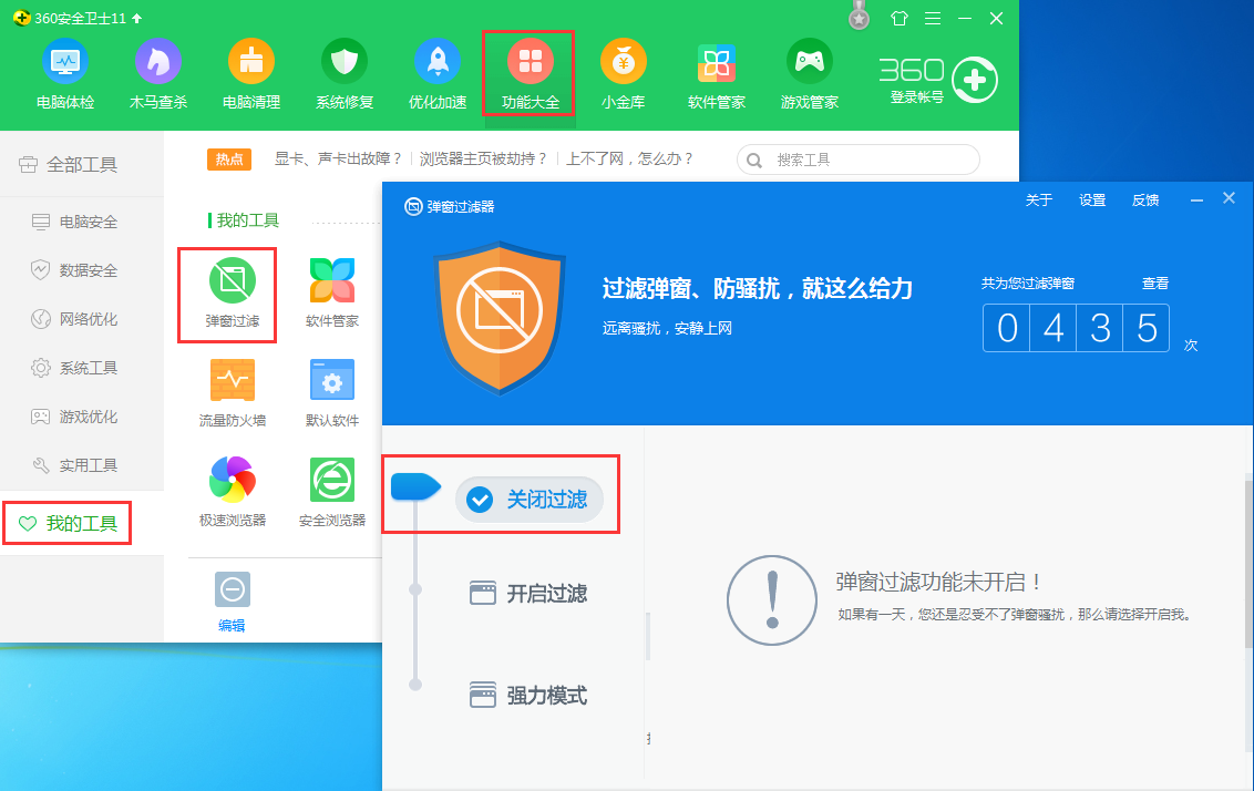打開360安全衛(wèi)士,在“功能大全”—》“我的工具”內(nèi)找到“彈窗過濾”工具打開彈窗過濾器,點擊“關閉過濾”即可。