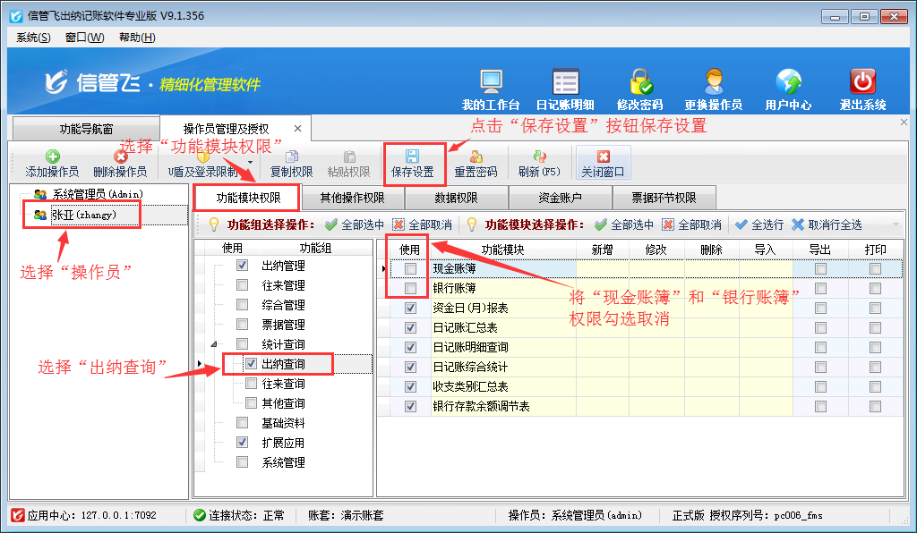 登錄軟件,在功能導(dǎo)航窗點擊“系統(tǒng)管理”—》“操作員及授權(quán)”,進(jìn)入“操作員管理及授權(quán)”界面,選擇操作員“張亞”,在其右側(cè)的功能模塊權(quán)限內(nèi)選擇“出納查詢”模塊,將現(xiàn)金賬簿和銀行賬簿的“使用”權(quán)限勾選取消,然后保存設(shè)置,如下圖所示。