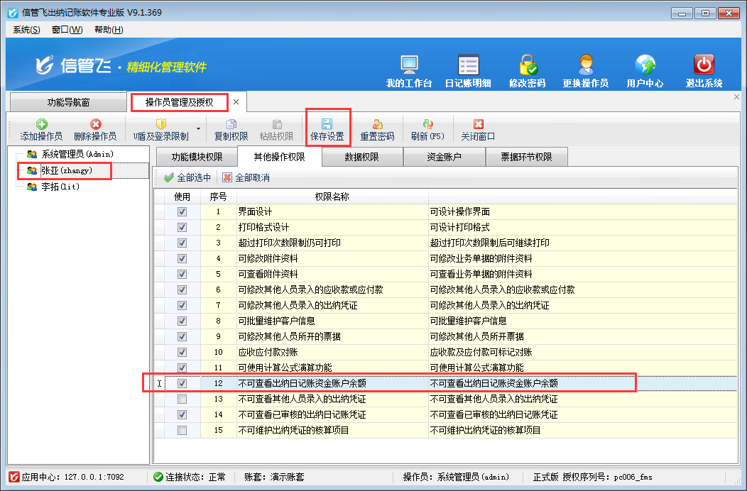 信管飛出納記賬軟件、信管飛RMS標(biāo)準(zhǔn)版和專業(yè)版都支持設(shè)置操作員不可查看出納日記賬資金賬戶余額權(quán)限,本篇文章以信管飛出納記賬軟件專業(yè)版為例詳細(xì)介紹一下如何設(shè)置操作員不可查看出納日記賬資金賬戶余額。