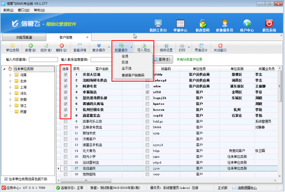 在功能導(dǎo)航窗選擇“基礎(chǔ)資料”—》“客戶信息”進(jìn)入客戶信息管理界面,選擇工具欄的“批量操作”按鈕,進(jìn)入批量操作模式,選擇需要刪除的客戶信息(批量操作支持全選、全不選、反選),如下圖所示: