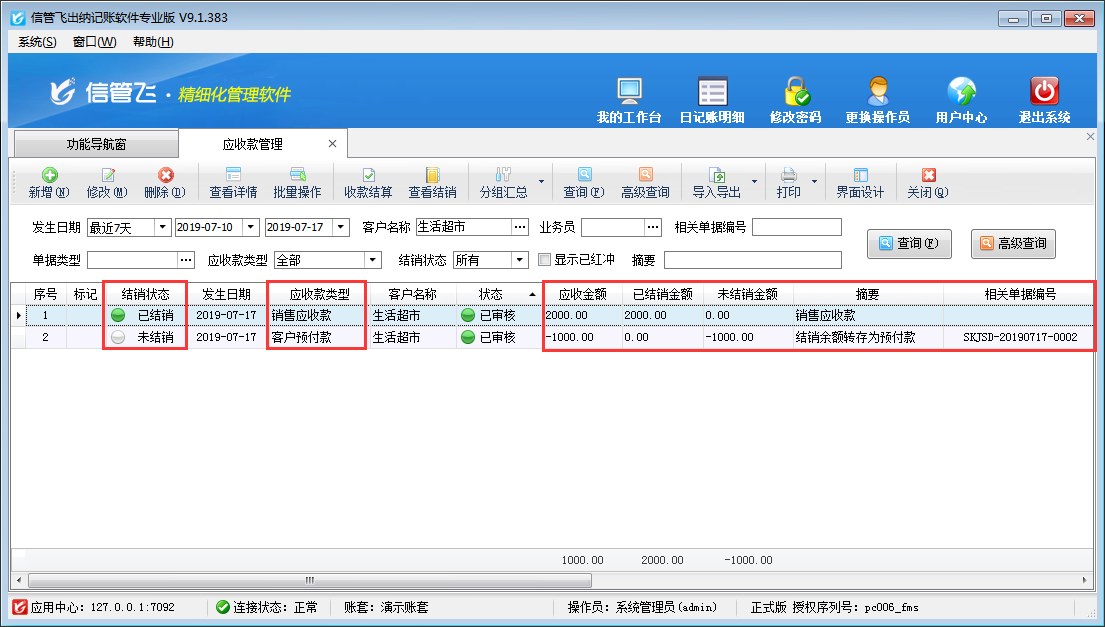 收款結算單單據審核之后,會更新應收款的結銷情況,在應收款管理內可以查看,如下圖所示。銷售應收款2000元已結銷,未結銷金額為0。另外系統自動生成了一個應收款類型為“客戶預付款”的應收款記錄,應收金額為-1000(預付款金額顯示為負數),摘要為“結銷余額轉存為預付款”,相關單據編號中顯示為轉存預付款的收款結算單單據編號。