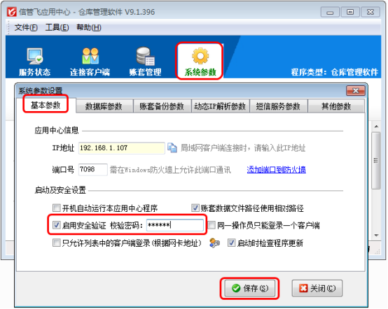 在應(yīng)用中心界面點(diǎn)擊“系統(tǒng)參數(shù)”,在“基本參數(shù)”界面打勾選擇“啟用安全驗證”,并輸入校驗密碼進(jìn)行保存(也可以在菜單中點(diǎn)擊“文件”——》“系統(tǒng)參數(shù)設(shè)置”進(jìn)入系統(tǒng)參數(shù)設(shè)置界面),下圖2為系統(tǒng)參數(shù)設(shè)置界面。
