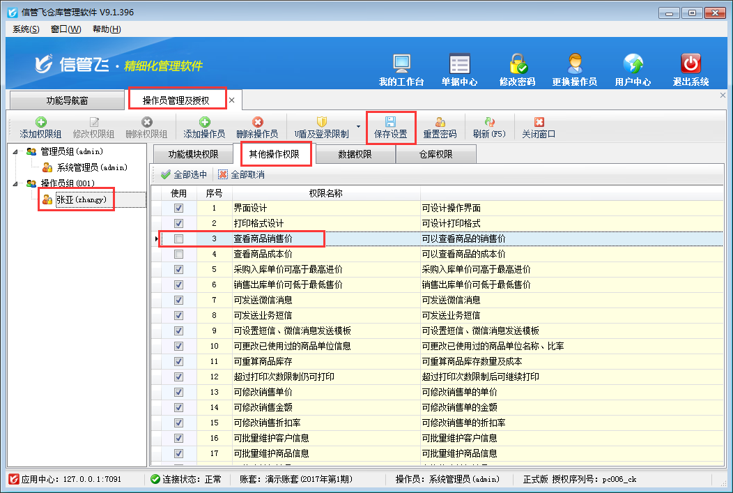 登錄信管飛倉(cāng)庫(kù)管理軟件,在功能導(dǎo)航窗點(diǎn)擊“系統(tǒng)管理”—》“操作員及授權(quán)”,即可進(jìn)入“操作員管理及授權(quán)”界面,如下圖所示,以操作員“張亞”為例,鼠標(biāo)選中操作員后,點(diǎn)擊“其他操作權(quán)限”,取消勾選“查看商品銷售價(jià)”,然后點(diǎn)擊“保存權(quán)限設(shè)置”即可。