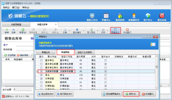 打開軟件的“銷售管理”模塊,新開一個銷售出庫單,在工具欄點擊“界面設(shè)計”選擇“單據(jù)明細(xì)”項,找到“當(dāng)前庫存數(shù)量”數(shù)據(jù)項并勾選上,保存界面設(shè)計,如下圖所示: