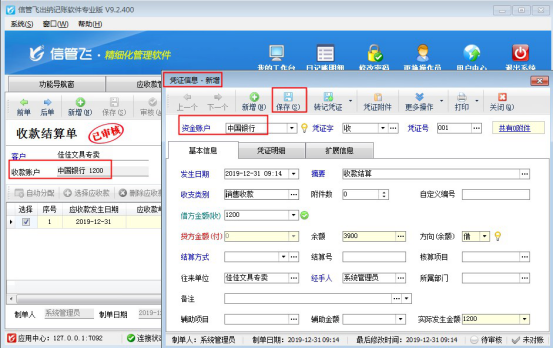 彈出“憑證信息”新增界面,轉(zhuǎn)記的出納憑證是銀行日記賬還是現(xiàn)金日記賬,取決于收款結(jié)算單上收款的資金賬戶(hù),示例收款賬戶(hù)是“中國(guó)銀行”,出納憑證的資金賬戶(hù)默認(rèn)是“中國(guó)銀行”賬戶(hù),在彈出的出納憑證新增界面,選擇下對(duì)應(yīng)的收支類(lèi)別和結(jié)算方式(銀行日記賬需填寫(xiě)),點(diǎn)擊“保存”按鈕即可。如下圖所示: