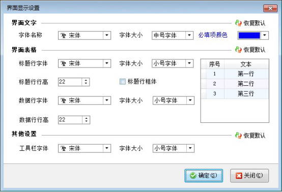 界面風格中可調整標題行行高和數據行行高,字體顯示大小也可以進行修改。修改后重新登錄軟件會變為修改后的顯示,下圖為修改后顯示: