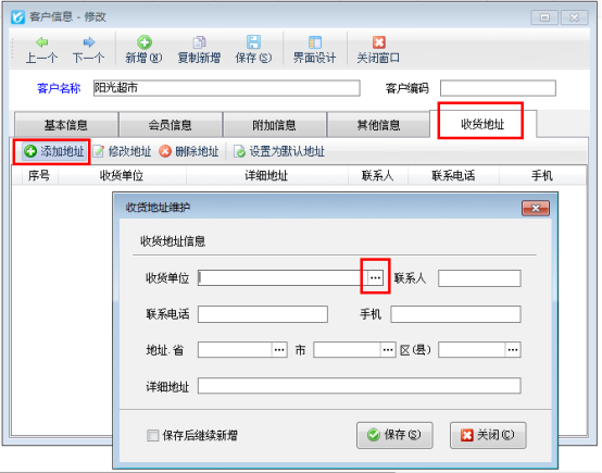 信管飛送貨單軟件、信管飛倉庫管理軟件、信管飛RMS開單時都可以錄入多個收貨地址,以滿足部分客戶有多個收貨地址的情況。下面我們以信管飛RMS為例介紹一下錄入多個收貨地址的具體的操作步驟。