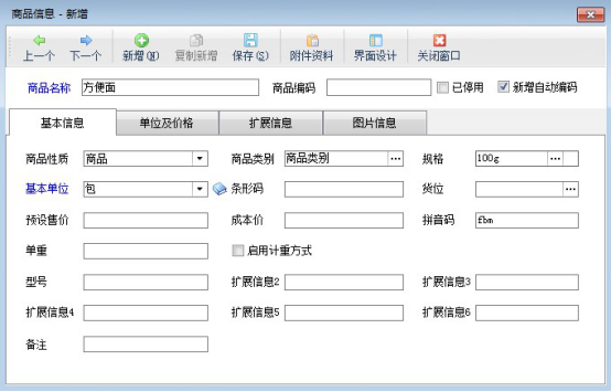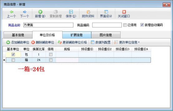 點擊“單位及價格”,進入單位及價格界面,添加輔助單位,設置基本單位與輔助單位之間的換算關系,如商品“方便面”的基本單位“包”與輔助單位“箱”之間的換算關系為一箱等于24包,如下圖所示: