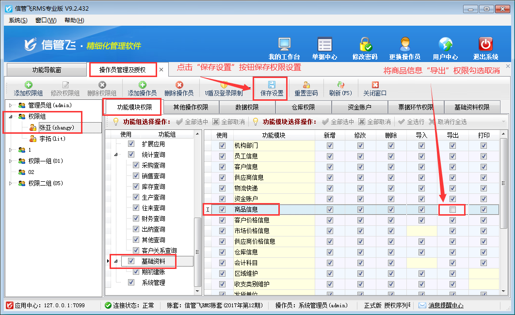 在功能導航窗點擊“系統管理”—》“操作員及授權”打開操作員管理及授權界面,選擇操作員“張亞”,在功能模塊權限界面,選擇“基礎資料”—》“商品信息”,在導出權限下,把商品信息“導出”權限勾選取消后保存權限,如下圖所示: