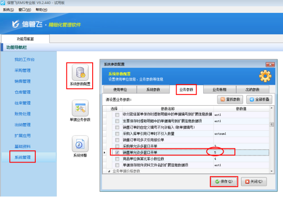 在功能導航窗點擊“系統管理”—》“系統參數配置”—》“業務參數”,即可進入到“業務參數”界面,在業務單據相關參數內,勾選“銷售單允許多窗口開單”參數,參數值內錄入需要銷售單的窗口數,然后點擊“保存”按鈕保存配置,如下圖所示: