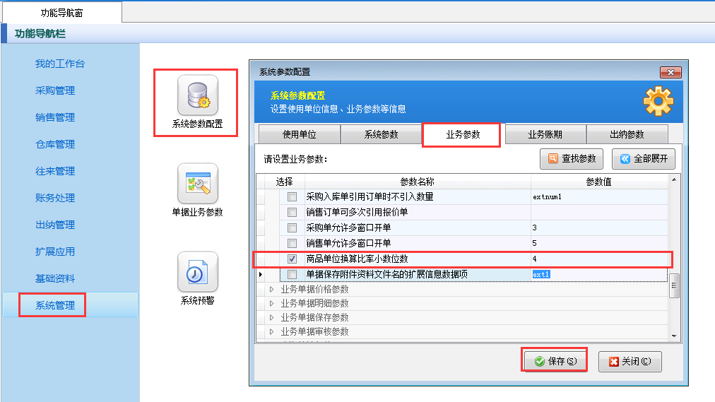 在功能導航窗點擊“系統管理”—》“系統參數配置”—》“業務參數”打開業務參數配置界面,然后在業務單據相關參數中打鉤啟用“商品單位換算比率小數位數”參數,并設置參數值,默認“2(即保留2位小數顯示)”,然后點擊“保存”按鈕保存參數配置,如下圖所示,設置商品單位換算比率小數保留4位顯示。