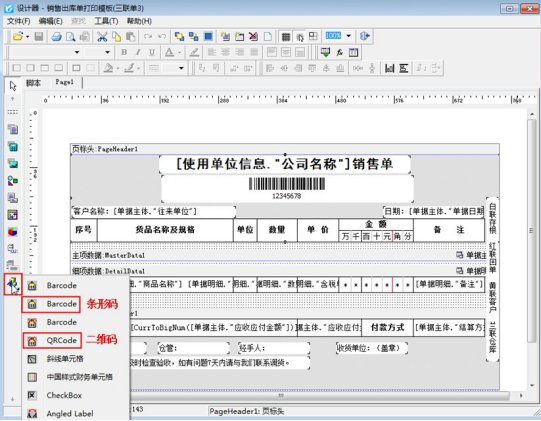 單據(jù)確認(rèn)開(kāi)單后,可打印出單據(jù)編號(hào)的條形碼發(fā)給倉(cāng)庫(kù)人員,條形碼可在打印模板中進(jìn)行設(shè)置,開(kāi)單界面打印按鈕下點(diǎn)擊打印格式設(shè)計(jì),在打印格式設(shè)計(jì)界面點(diǎn)擊“設(shè)計(jì)格式”,進(jìn)入模板設(shè)計(jì)器界面,點(diǎn)擊左側(cè)工具欄的最后一個(gè)圖標(biāo),選擇第二個(gè)“Barcode”后在模板上添加文本框,然后雙擊打開(kāi)文本框,彈出的條碼編輯器中代碼取“單據(jù)主體-單據(jù)編號(hào)”、條碼類型取“Code128”(二維碼選擇“QRCode”;二維碼直接雙擊選擇數(shù)據(jù)項(xiàng)單據(jù)主體-單據(jù)編號(hào)),設(shè)置好后點(diǎn)擊確定,然后預(yù)覽模板可顯示單據(jù)編號(hào)的條形碼信息。如下圖所示: