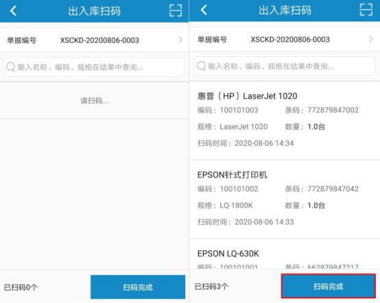 出入庫(kù)掃碼界面,點(diǎn)擊右上角掃描圖標(biāo),然后掃描單據(jù)編號(hào)的條形碼,掃碼后自動(dòng)進(jìn)入掃描商品信息界面,繼續(xù)點(diǎn)擊掃描圖標(biāo),針對(duì)商品的條形碼進(jìn)行掃描,會(huì)自動(dòng)獲取商品信息到出入庫(kù)掃碼界面,(默認(rèn)掃描數(shù)量為1,如存在出庫(kù)多個(gè)相同商品,可掃描多次)掃描完成后點(diǎn)擊“掃碼完成”,如下圖所示: