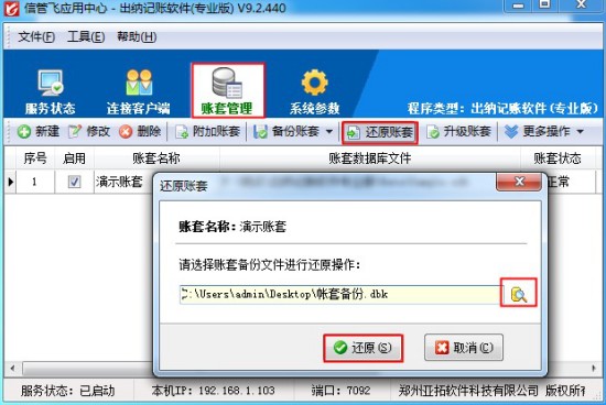 點擊“備份帳套”后會在桌面上生成一個名稱為“帳套備份.dbk”的文件(名稱可自己取),復制到新電腦上,在新電腦上安裝下軟件,軟件安裝包可在官網(wǎng)上下載(軟件下載地址),然后在應用中心程序帳套管理界面點擊“還原帳套”,選擇復制過去的備份文件進行還原,如下圖所示: