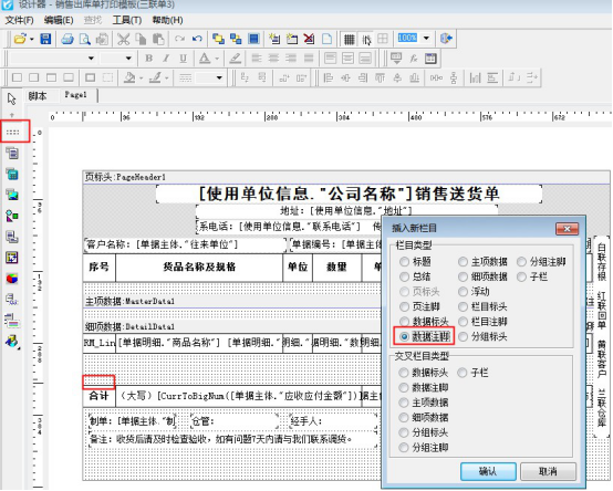需要合計在最后一頁顯示,需要把“頁注腳”換為“數(shù)據(jù)注腳”,在模板設(shè)計器界面,點擊“頁注腳”進(jìn)行刪除,然后點擊左側(cè)工具欄的第一項,選擇“數(shù)據(jù)注腳”,添加到合計的位置處,如下圖所示: