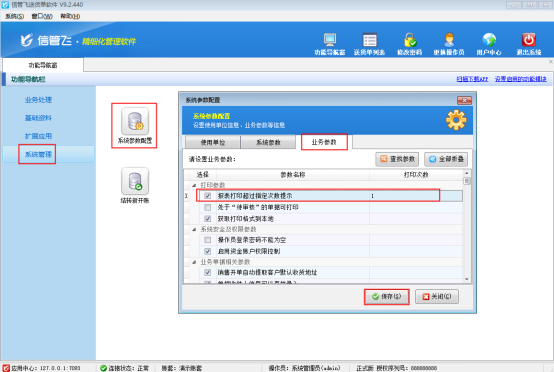 在業(yè)務(wù)參數(shù)界面將打印參數(shù)內(nèi)“報(bào)表打印超過(guò)指定次數(shù)提示”勾選上,并將打印次數(shù)設(shè)置一下,軟件中默認(rèn)的打印次數(shù)是1,可以根據(jù)自己的實(shí)際需求進(jìn)行設(shè)置,最后進(jìn)行保存。