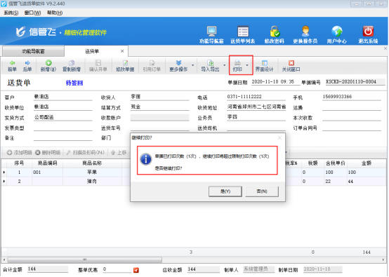 設(shè)置報(bào)表打印超過(guò)打印次數(shù)提示后,在業(yè)務(wù)單據(jù)打印時(shí)(基礎(chǔ)資料、統(tǒng)計(jì)查詢功能中沒(méi)有限制)如果單據(jù)打印的次數(shù)超過(guò)限制數(shù)量,系統(tǒng)會(huì)提示“單據(jù)已打印次數(shù)(1次),繼續(xù)打印將超過(guò)限制打印次數(shù)(1次),是否繼續(xù)打印?”,如下圖所示: