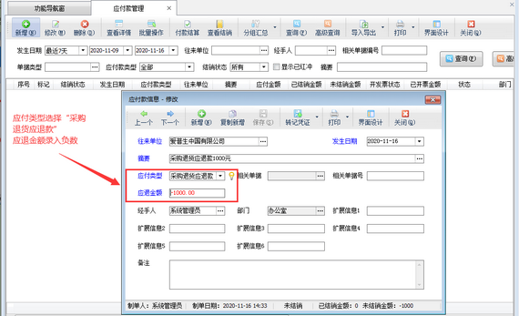 在功能導航窗點擊“往來管理”—》“應付款管理”,即可打開應付款管理界面,在工具欄點擊“新增”按鈕,系統(tǒng)打開新增應付款窗口,如下圖所示,“應付類型”選擇為“采購退貨應退款”,然后錄入應退金額及其他數(shù)據(jù)后保存此應付款信息即可。