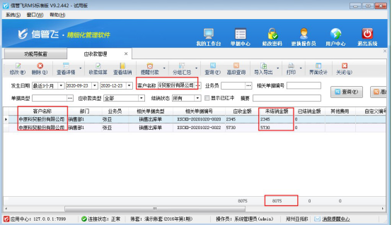 參數(shù)設(shè)置完成后,功能導(dǎo)航窗點(diǎn)擊“往來管理”—》“應(yīng)收款管理”可查看所有應(yīng)收款記錄。選擇示例客戶“中原科貿(mào)股份有限公司”匯總其應(yīng)收款,可看到有10月兩筆待結(jié)銷應(yīng)收款記錄。總金額為:8075元,如下圖所示: