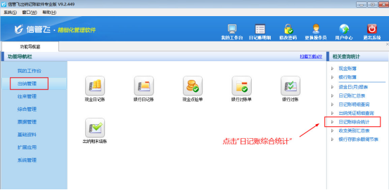 然后在“出納管理”模塊最右側(cè)的“相關(guān)查詢統(tǒng)計(jì)”內(nèi)點(diǎn)擊“日記賬綜合統(tǒng)計(jì)”,如圖2所示,系統(tǒng)打開“日記賬綜合統(tǒng)計(jì)”界面,如圖3所示。