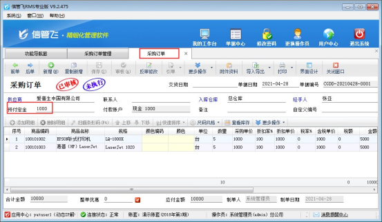 信管飛RMS星光版、標準版、專業(yè)版支持把采購貨品付部分定金給供應商的金額錄入到軟件中,在實際付款給供應商的時候可以扣除預付的定金金額,本文以“信管飛RMS專業(yè)版”為例示范下采購預付款如何沖抵采購應付款?