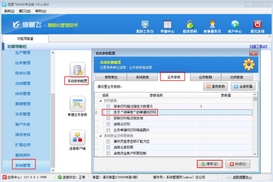 軟件默認(rèn)允許“未審核”狀態(tài)的允許打印,在功能導(dǎo)航窗點(diǎn)擊“系統(tǒng)管理”—》“系統(tǒng)參數(shù)設(shè)置”,選擇業(yè)務(wù)參數(shù),把參數(shù)“處于“待審核”的單據(jù)可打印”取消勾選,然后保存配置,如下圖所示: