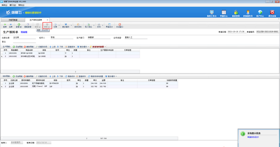 開生產(chǎn)領(lǐng)料出庫(kù)單,錄入單據(jù)主體、生產(chǎn)明細(xì)和領(lǐng)料明細(xì)信息,保存單據(jù)后可以看到生產(chǎn)領(lǐng)料單界面工具欄審核按鈕是灰色,操作員將無法再審核生產(chǎn)領(lǐng)料單單據(jù)。如下圖所示: