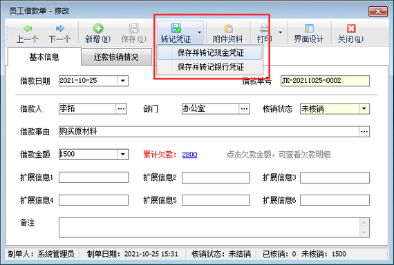 在員工借款管理界面工具欄點擊“新增借款單”,打開新增借款單界面可以錄入借款信息,借款信息填寫完成后保存借款單,借款單保存后,新增借款單界面工具欄點擊“轉記憑證”即可轉記現金及銀行憑證。