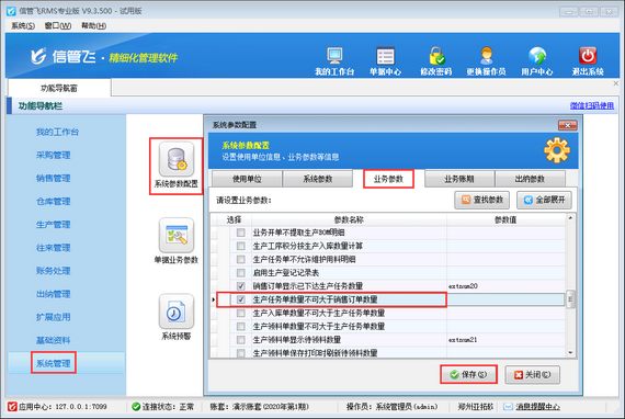 在功能導(dǎo)航窗點擊“系統(tǒng)管理”—》“系統(tǒng)參數(shù)配置”—》“業(yè)務(wù)參數(shù)”打開業(yè)務(wù)參數(shù)配置界面,在生產(chǎn)管理相關(guān)參數(shù)中打鉤啟用“生產(chǎn)任務(wù)單數(shù)量不可大于銷售訂單數(shù)量”參數(shù),如下圖所示。