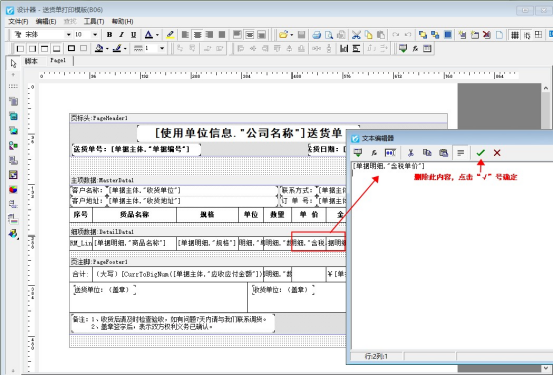 在送貨單開單界面,點擊打印按鈕下的“打印格式設(shè)計”,選擇此模板,點擊“設(shè)計格式”進入模板設(shè)計器界面。在模板設(shè)計器中,把單價和金額對應的明細數(shù)據(jù)項文本框雙擊打開,把里面調(diào)用的數(shù)據(jù)項刪除,然后保存模板,如下圖所示: