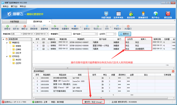 信管飛送貨單軟件是一款集訂單、送貨單、退貨單、應收款管理為一體的送貨打印軟件,軟件支持設置操作員賬號及操作員權限,本篇文章介紹一下送貨單軟件如何設置操作員只查看本人送貨單、退貨單數據?