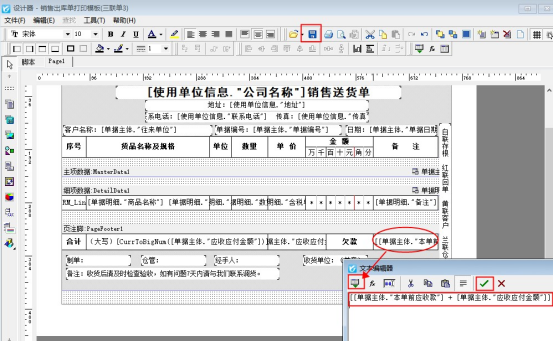 在模板設(shè)計(jì)器中,新增一個(gè)文本框(新增文本框在左側(cè)工具欄添加),打開新建文本框然后輸入名稱:欠款,調(diào)用數(shù)據(jù)項(xiàng)“[[單據(jù)主體."本單前應(yīng)收款"] + [單據(jù)主體."應(yīng)收應(yīng)付金額"]]”,點(diǎn)擊“√”確定保存,如下圖所示:
