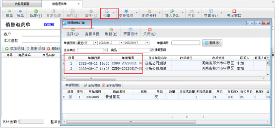 在功能導航窗點擊“銷售管理”—》“銷售退貨單”,進入銷售退貨單界面,在銷售退貨單界面工具欄內點擊“引單”—》“銷售訂單”可打開“選擇銷售訂單”窗口,在此窗口選擇相應的銷售訂單,然后保存并審核,如下圖所示: