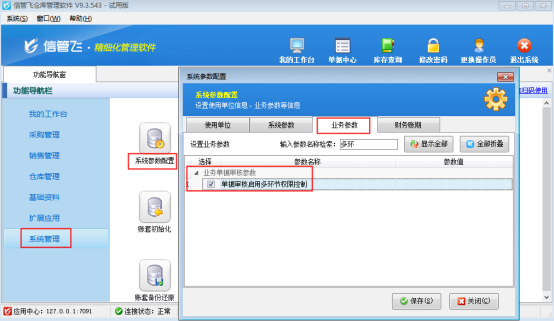 軟件多級審核最多支持5級審核,支持設(shè)置各類單據(jù)。本文以“銷售出庫單”為例示范。首先需啟用參數(shù),在功能導(dǎo)航窗點(diǎn)“系統(tǒng)管理”→“系統(tǒng)參數(shù)配置”→“業(yè)務(wù)參數(shù)”,勾選“單據(jù)審核啟用多環(huán)節(jié)權(quán)限控制”,點(diǎn)擊“保存”按鈕,如下圖所示: