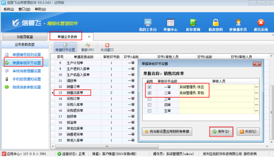 系統(tǒng)參數(shù)設(shè)置完成后,在“系統(tǒng)管理”→“單據(jù)業(yè)務(wù)參數(shù)”中選擇左側(cè)工具欄的“單據(jù)審核環(huán)節(jié)設(shè)置”,選擇“銷售出庫單”,點(diǎn)擊“單據(jù)環(huán)節(jié)設(shè)置”,啟用“一審”和“二審”并設(shè)置對應(yīng)審核環(huán)節(jié)的審核人員“張亞”和“李拓”,然后保存設(shè)置,如下圖所示: