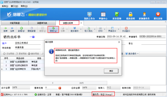 “一審”操作員“張亞”登錄軟件,新開銷售出庫單,保存并審核單據(jù),審核狀態(tài)顯示“一審”,操作員“張亞”沒有二審權(quán)限,再次點(diǎn)擊“審核”會提示“系統(tǒng)已啟用多環(huán)節(jié)審核權(quán)限控制,您沒有當(dāng)前環(huán)節(jié)的審核權(quán)限!”如下圖所示: