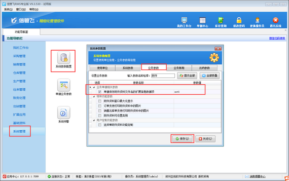 在功能導(dǎo)航窗點擊“系統(tǒng)管理”—》“系統(tǒng)參數(shù)配置”—》“業(yè)務(wù)參數(shù)”打開業(yè)務(wù)參數(shù)配置界面,在“業(yè)務(wù)單據(jù)相關(guān)參數(shù)”內(nèi)啟用參數(shù)“單據(jù)保存附件資料文件名的擴展信息數(shù)據(jù)項”,并設(shè)置參數(shù)值,默認(rèn)是“ext1”(單據(jù)主體.擴展信息1)。