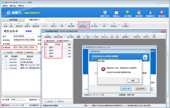 參數(shù)設(shè)置好之后,新增業(yè)務(wù)單據(jù)時如添加了附件資料,系統(tǒng)可直接將附件資料文件名存儲到此單據(jù)的“單據(jù)主體.擴展信息1”數(shù)據(jù)項內(nèi),如下圖所示,銷售出庫單添加了“附件1、附件2、附件3、附件4”4個附件,附件文件名可直接存儲在“單據(jù)主體.擴展信息1”內(nèi)方便查看(“擴展信息1”數(shù)據(jù)項如不顯示,可通過界面設(shè)計配置顯示出來)。