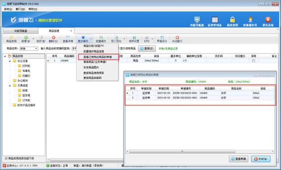 出現此問題的原因是:此商品在單據內使用過,可在商品信息界面工具欄點擊“更多操作”下拉列表點擊“查看已使用此商品的單據”按鈕查看已使用此商品的單據詳情,如下圖所示。