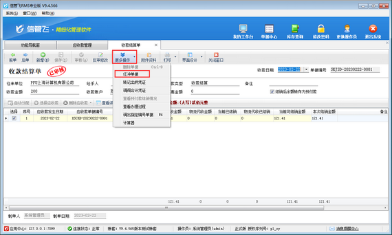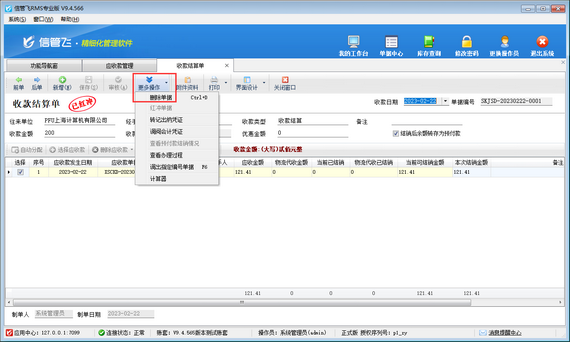 在收款結(jié)算單界面工具欄點(diǎn)擊“更多操作”—》“紅沖單據(jù)”,紅沖收款結(jié)算單,收款結(jié)算單紅沖后,在工具欄點(diǎn)擊“更多操作”—》“刪除單據(jù)”,可將此收款結(jié)算單刪除,如下圖所示。