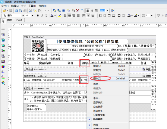 如何在打印模板上刪除顏色數(shù)據(jù)列?打印模板格式因為尺寸固定,需要刪除明細列,刪除后增加其他文本框的寬度。在開單界面打印下選擇打印格式設(shè)計,打印格式設(shè)計界面點擊“設(shè)計格式”,進入模板設(shè)計器界面,選擇需要刪除的文本框,鼠標(biāo)左鍵單擊選擇文本框(需要多選可按著shift鍵鼠標(biāo)分別單擊,可同時刪除兩個文本框),下一步鼠標(biāo)右鍵,刪除,如圖所示: