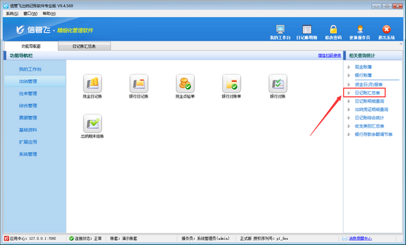 在功能導(dǎo)航窗點擊“出納管理”,右側(cè)相關(guān)查詢統(tǒng)計下,點擊“日記賬匯總表”打開日記賬匯總表統(tǒng)計查詢界面,如下圖所示。