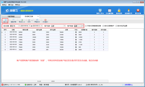 在日記賬匯總表界面,選擇統(tǒng)計日期范圍,賬戶名稱和賬戶類型選擇“全部”,然后點擊“統(tǒng)計”按鈕即可統(tǒng)計查詢?nèi)掌诜秶鷥?nèi)每日所有賬戶借/貸方發(fā)生總金額、每日余額,如下圖所示。