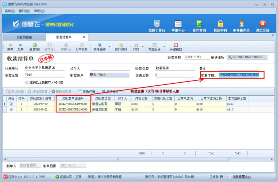 參數設置完成后,功能導航窗點擊“往來管理”—“應收款管理”,選擇未結銷的應收款記錄,點擊“收款結算”進入收款結算單界面。收款結算單打開“界面設計”,單據主體中勾選顯示擴展信息1,移動到合適位置后保存界面設計,然后正常結算,結算單保存后對應的應收款的記錄的銷售單單據編號會自動提取到擴展信息1中,如下圖所示: