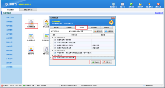 設(shè)置方法如下:點(diǎn)擊左側(cè)功能導(dǎo)航窗,“系統(tǒng)管理”—》“系統(tǒng)參數(shù)配置”—》“業(yè)務(wù)參數(shù)”,進(jìn)入“業(yè)務(wù)參數(shù)”配置界面,在特殊功能參數(shù)下打勾啟用“采購入庫成本價(jià)不包括運(yùn)費(fèi)”參數(shù),勾選之后后點(diǎn)擊“保存”按鈕進(jìn)行保存,如圖所示: