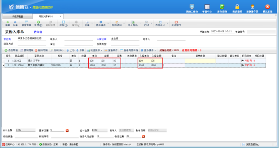 新開一個采購入庫單,新增商品,輸入運(yùn)費(fèi),采購入庫成本價(jià)默認(rèn)是包括運(yùn)費(fèi)的,如圖所示:
